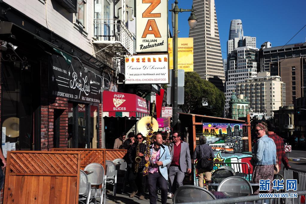 6月15日,一支樂隊(duì)在美國加利福尼亞州舊金山街頭演奏。