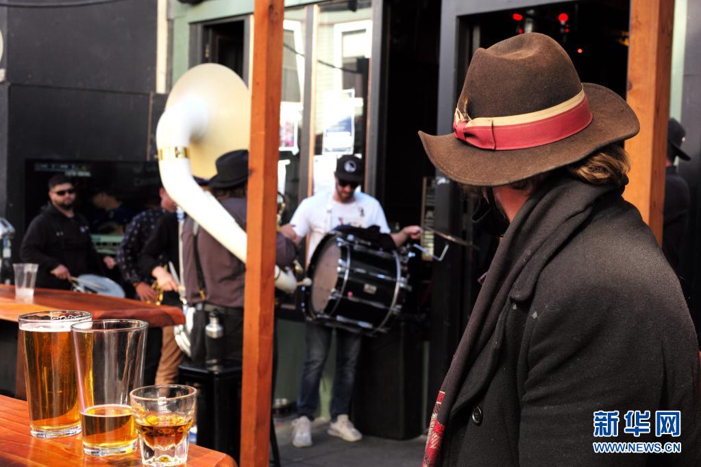 6月15日,一支樂隊在美國加利福尼亞州舊金山一家酒吧外演奏。