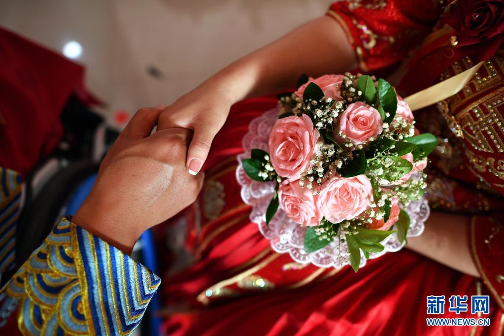 新郎周海云在婚禮上拉著新娘關(guān)美的手(6月15日攝)。新華社記者 詹彥 攝