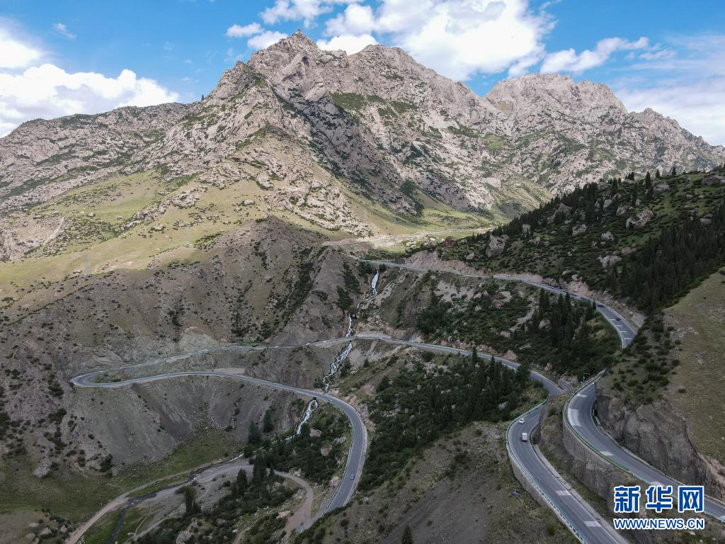 車輛行駛在新疆獨(dú)庫公路的一處盤山路段(6月20日攝,無人機(jī)照片)。