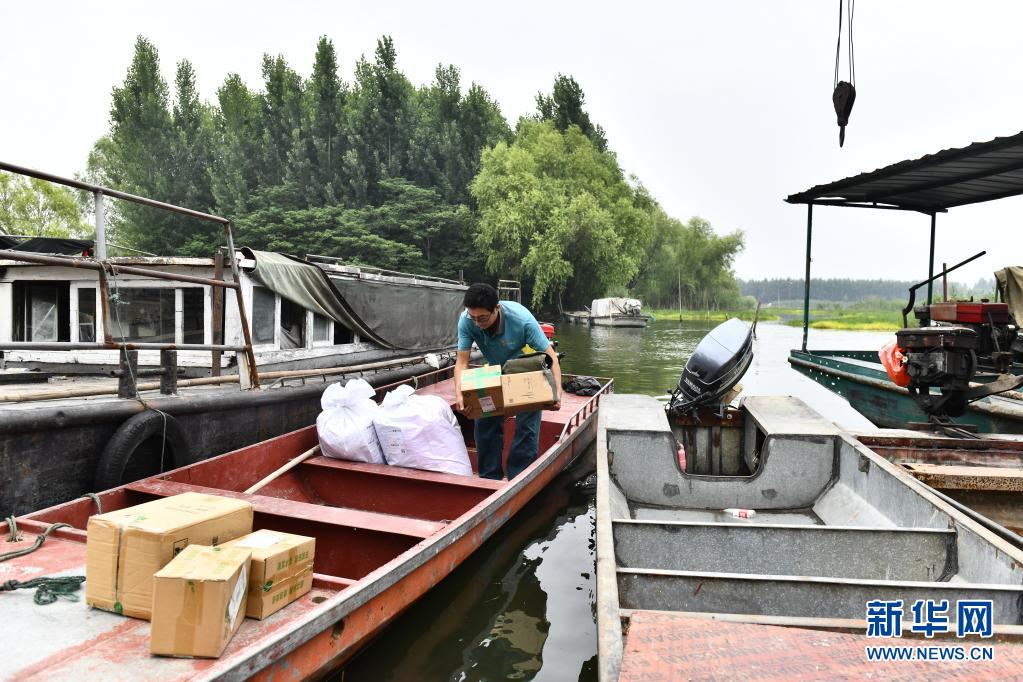 6月20日,在微山縣南陽鎮(zhèn),郵遞員王少朋往郵船上裝郵件,準(zhǔn)備為村民投遞。