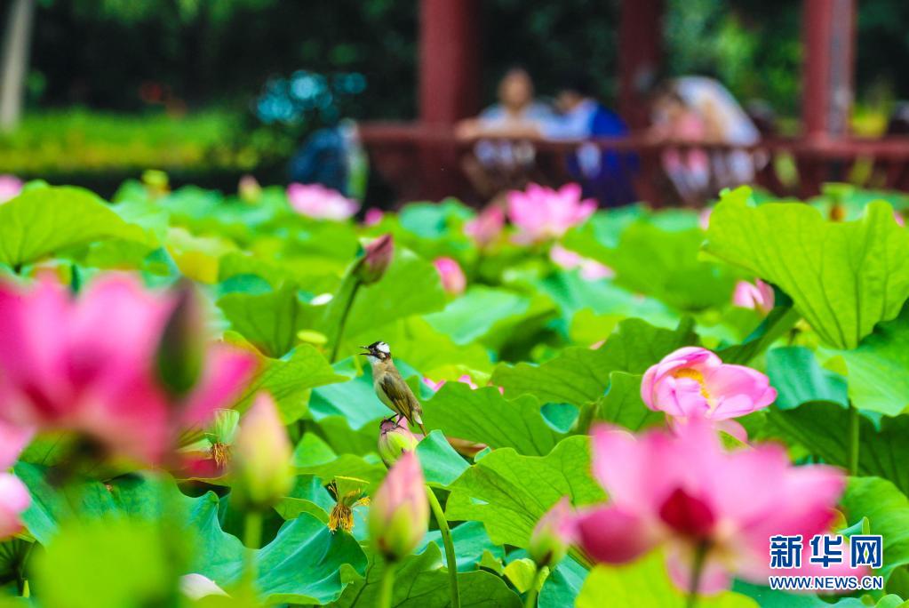 6月21日,河南省南陽市月季公園荷花塘,一只鳥在花苞上停歇。