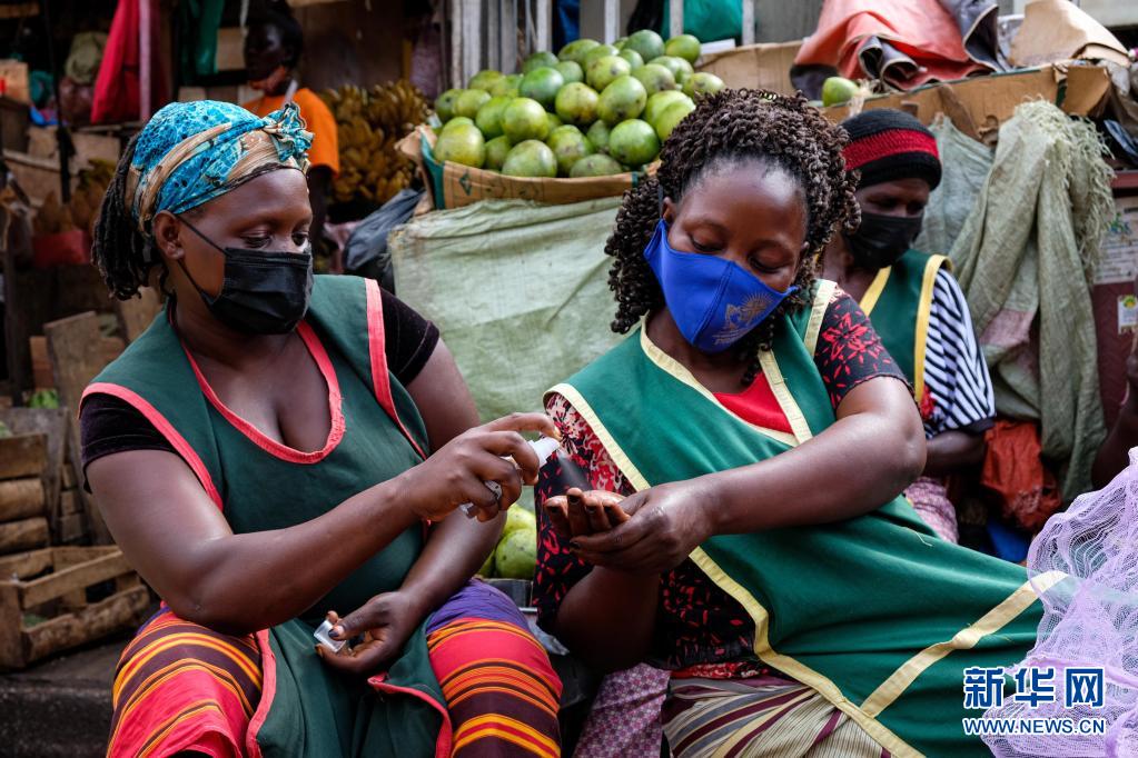 6月23日,商販在烏干達(dá)坎帕拉的納卡塞羅市場(chǎng)使用手部消毒液。