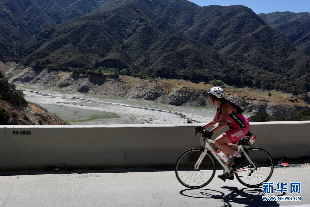 6月24日,一名女子騎車經(jīng)過美國(guó)加利福尼亞州洛杉磯縣阿祖薩市附近的圣加布里埃爾水庫(kù)。