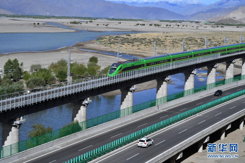 試運(yùn)行的復(fù)興號列車行駛在雅魯藏布江畔(6月16日攝)。