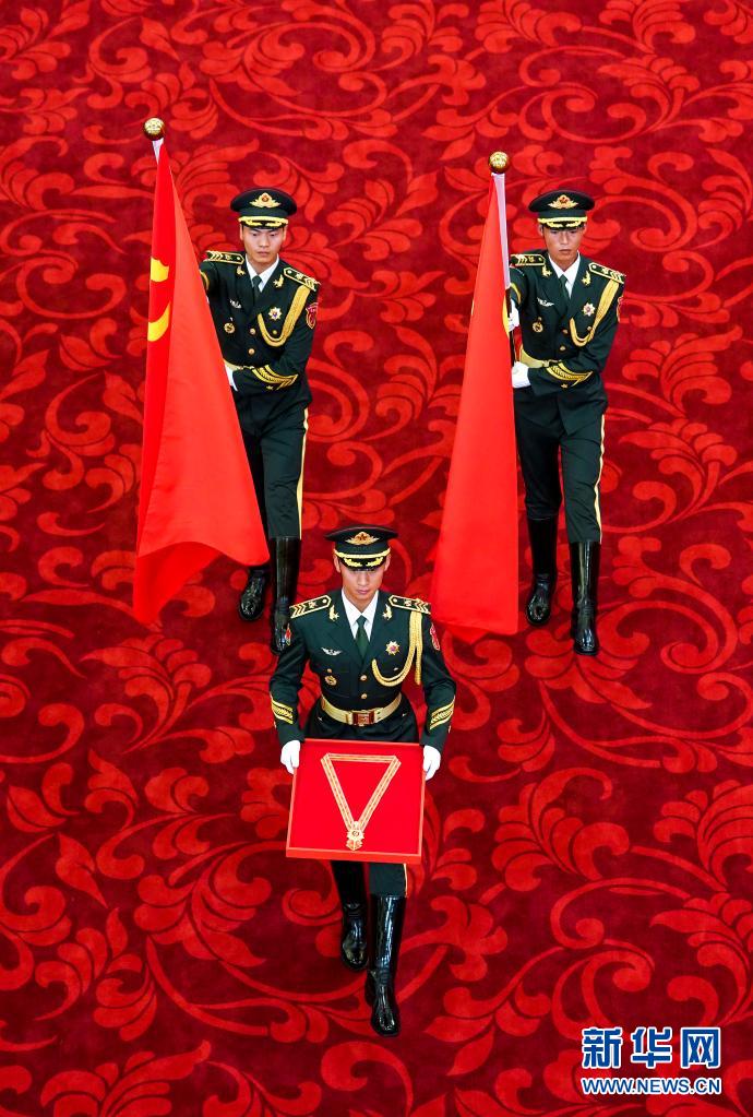 6月29日,慶祝中國共產(chǎn)黨成立100周年“七一勛章”頒授儀式在北京人民大會堂金色大廳隆重舉行。這是2名旗手高擎黨旗,1名禮兵手捧“七一勛章”,行進(jìn)到儀式現(xiàn)場。新華社記者 高潔 攝