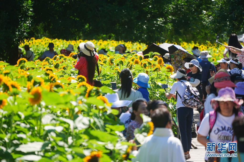 7月4日,游客在北京奧林匹克森林公園北園觀(guān)賞向日葵。
