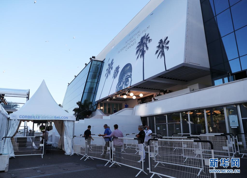 7月5日,工作人員在法國(guó)戛納的電影宮外為開幕式做準(zhǔn)備。