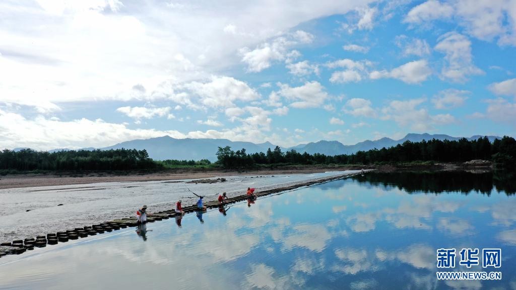 當(dāng)日,浙江省臺(tái)州市仙居縣永安溪流域水面如鏡,藍(lán)天、白云倒影水中,構(gòu)成一幅美麗的畫卷。新華社發(fā)(王華斌 攝)