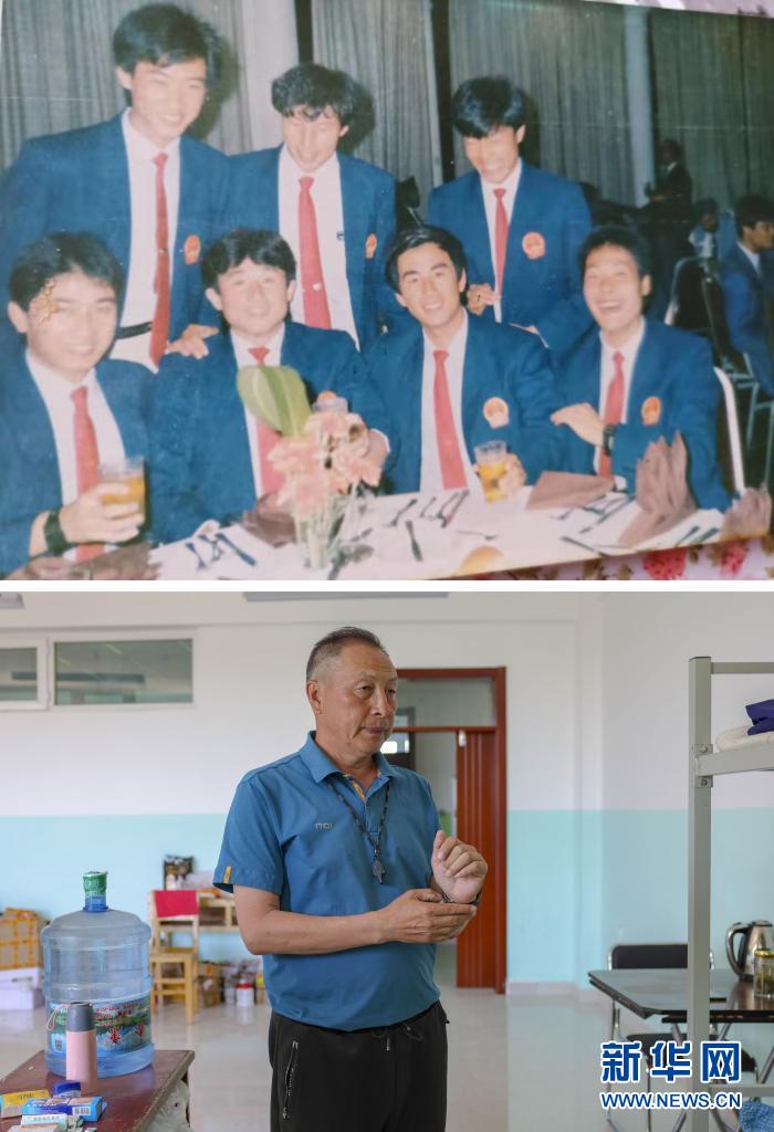 這是一張拼版照片:上圖為20世紀80年代杜寶柱(后排中)參加國際比賽時和隊員們的合影(受訪者供圖);下圖為杜寶柱教練在塔城市第二小學宿舍內(nèi)整理裝備,準備出門帶隊訓(xùn)練(6月12日攝,新華社記者 胡虎虎 攝)。