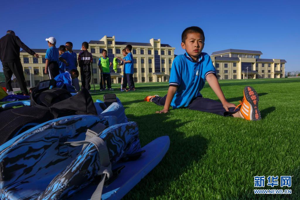 塔城市第二小學(xué)曲棍球隊的小隊員在訓(xùn)練賽前拉伸身體,準(zhǔn)備上場(6月13日攝)。