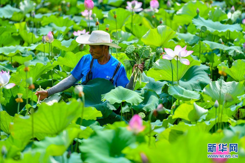 7月11日,在湖南省湘潭市雨湖區(qū)姜畬鎮(zhèn)聯(lián)映村,蓮農(nóng)在荷塘采摘蓮蓬。新華社記者 陳澤國(guó) 攝