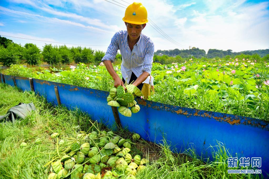 7月11日,在湖南省湘潭市雨湖區(qū)姜畬鎮(zhèn)聯(lián)映村,蓮農(nóng)收集采摘好的蓮蓬。新華社記者 陳澤國 攝