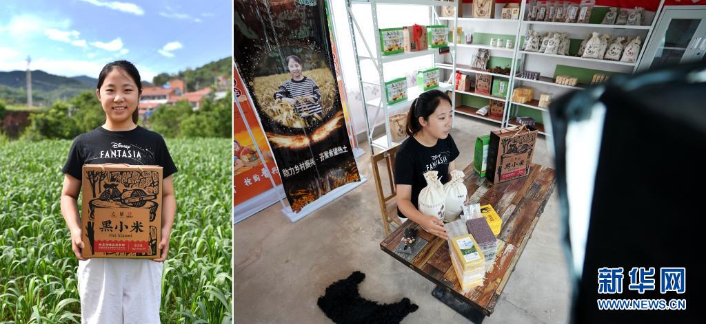 拼版照片:左圖為王亞妮在山西省平順縣南坡村展示包裝好的小米;右圖為王亞妮通過網(wǎng)絡直播介紹合作社的小米、玉米糝、豆類等農(nóng)產(chǎn)品(7月9日攝)。今年26歲的王亞妮曾是一所學校的輔導員,2019年回到家鄉(xiāng)創(chuàng)業(yè)。身為農(nóng)民的孩子,王亞妮懂得父輩的辛苦和無奈,勞作一年到收獲季節(jié),農(nóng)產(chǎn)品卻賣不上好價錢。她一直想改變這種現(xiàn)狀,互聯(lián)網(wǎng)讓她看到了希望。通過電商銷售,合作社的農(nóng)產(chǎn)品銷往了全國各地。