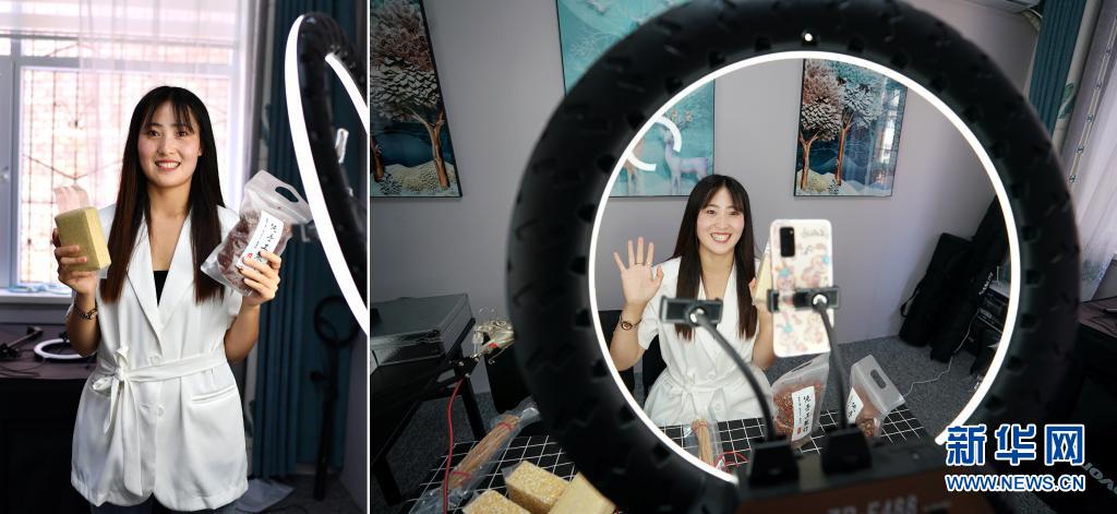 拼版照片:左圖為何雪艷在山西省平順縣龍鎮(zhèn)村電商服務(wù)中心直播間里;右圖為何雪艷通過(guò)網(wǎng)絡(luò)直播介紹農(nóng)產(chǎn)品(7月8日攝)。今年25歲的何雪艷是龍鎮(zhèn)村電商服務(wù)中心的網(wǎng)絡(luò)主播,從一個(gè)“電商小白”變身網(wǎng)絡(luò)主播不到一年時(shí)間,何雪艷已成為龍鎮(zhèn)村帶貨能力頗強(qiáng)的“網(wǎng)紅”。從最初直播時(shí)結(jié)結(jié)巴巴,到如今精準(zhǔn)掌握網(wǎng)絡(luò)語(yǔ)言,何雪艷和村里其他主播變得越來(lái)越熟練。