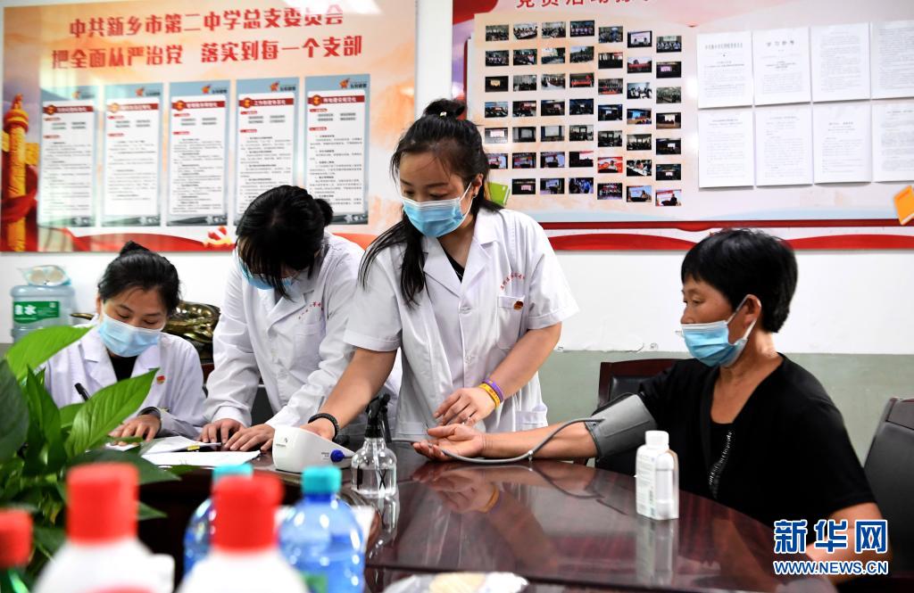 7月25日,醫(yī)護(hù)人員在河南省新鄉(xiāng)市第二中學(xué)臨時(shí)醫(yī)療救助點(diǎn)為轉(zhuǎn)移村民測(cè)量血壓。