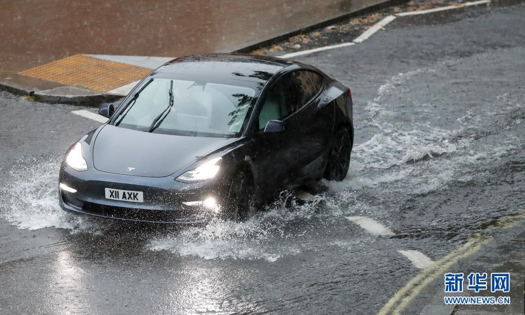 7月25日,一輛汽車(chē)在英國(guó)倫敦積水的路面上行駛。