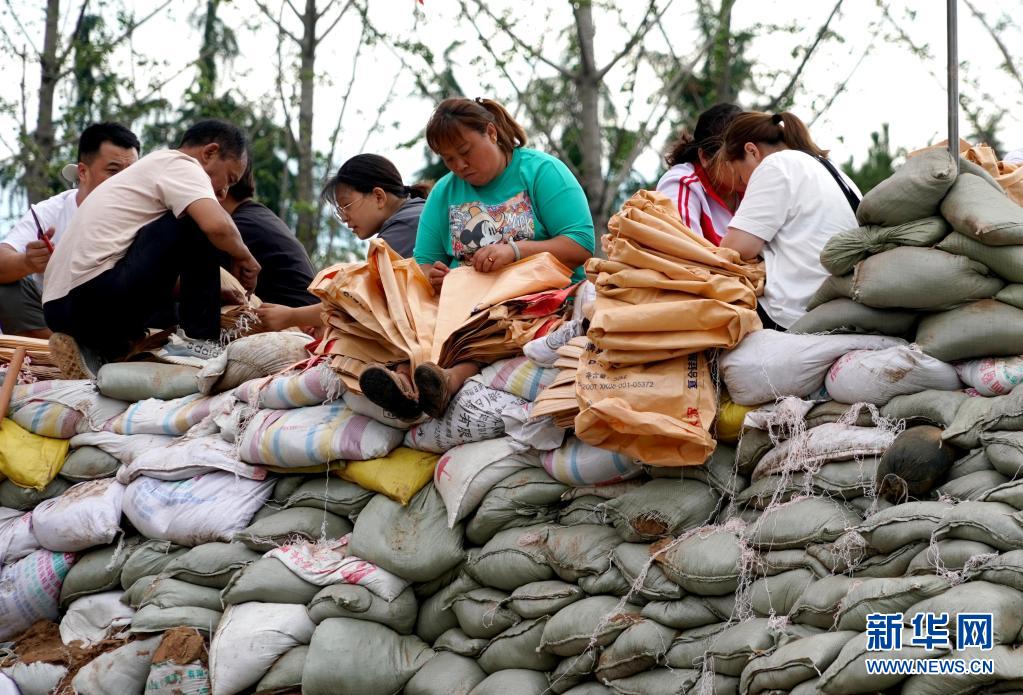 7月29日,群眾在??h傅莊堤上為救援人員準備沙袋裝沙。
