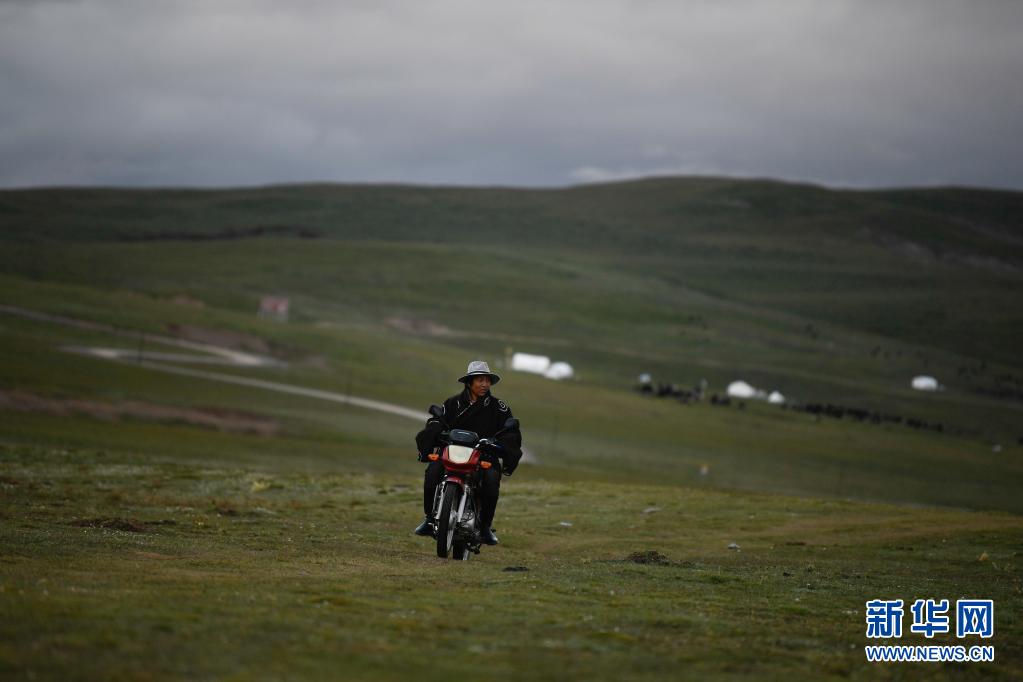8月3日,在瑪沁縣當洛鄉(xiāng)貢龍村的夏季草場上,牧民騎著摩托車在查看牛羊。