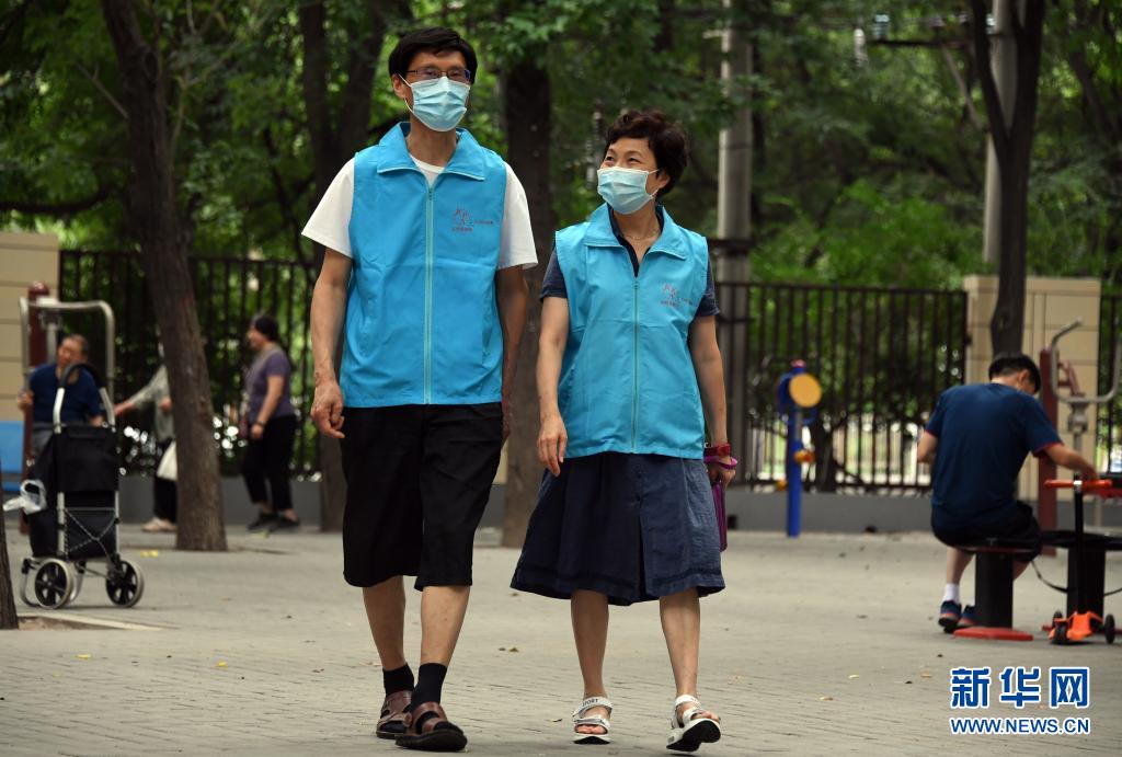 8月14日,在北京市海淀區(qū)薊門里社區(qū),馮向東與妻子董星梅準備去做志愿服務。