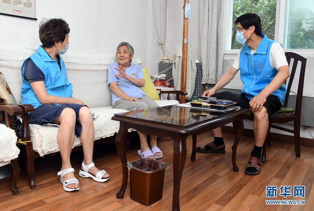 8月14日,在北京市海淀區(qū)薊門里社區(qū),董星梅(左)和丈夫馮向東(右)與他們的志愿服務對象交談。