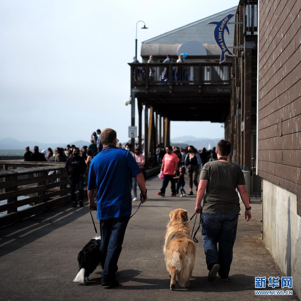 8月15日,人們在美國舊金山海邊碼頭遛狗。