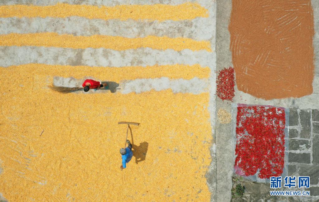 8月17日,赤水市華陽(yáng)村的村民在晾曬玉米(無(wú)人機(jī)照片)。