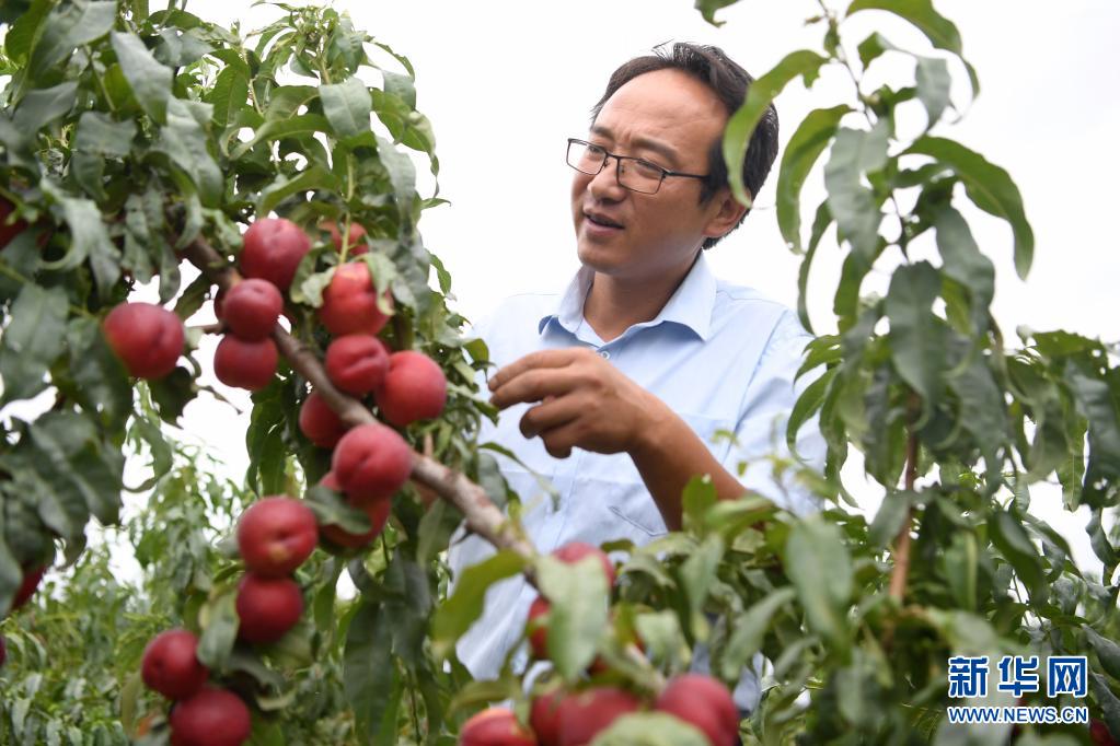 8月18日,方志利在查看桃子生長(zhǎng)情況。