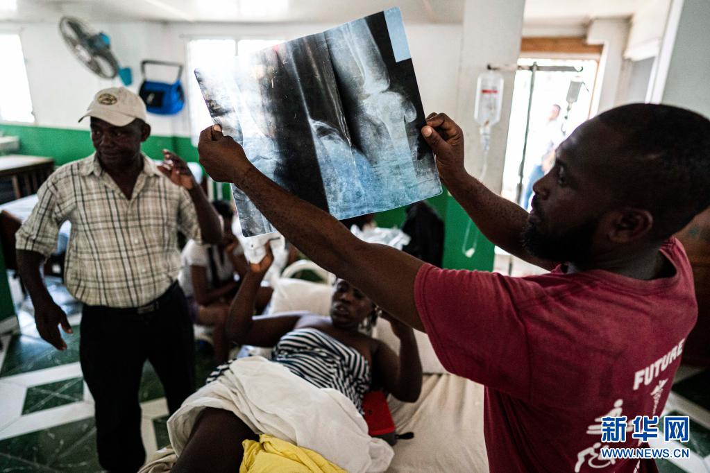 8月18日,一名男子在海地震中附近的萊凱的一家醫(yī)院展示X光片。
