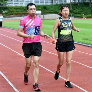 猛龍長跑隊視聽障跑手蔡浩良(左)與隊友一起練跑(7月29日攝)。新華社記者 盧炳輝 攝