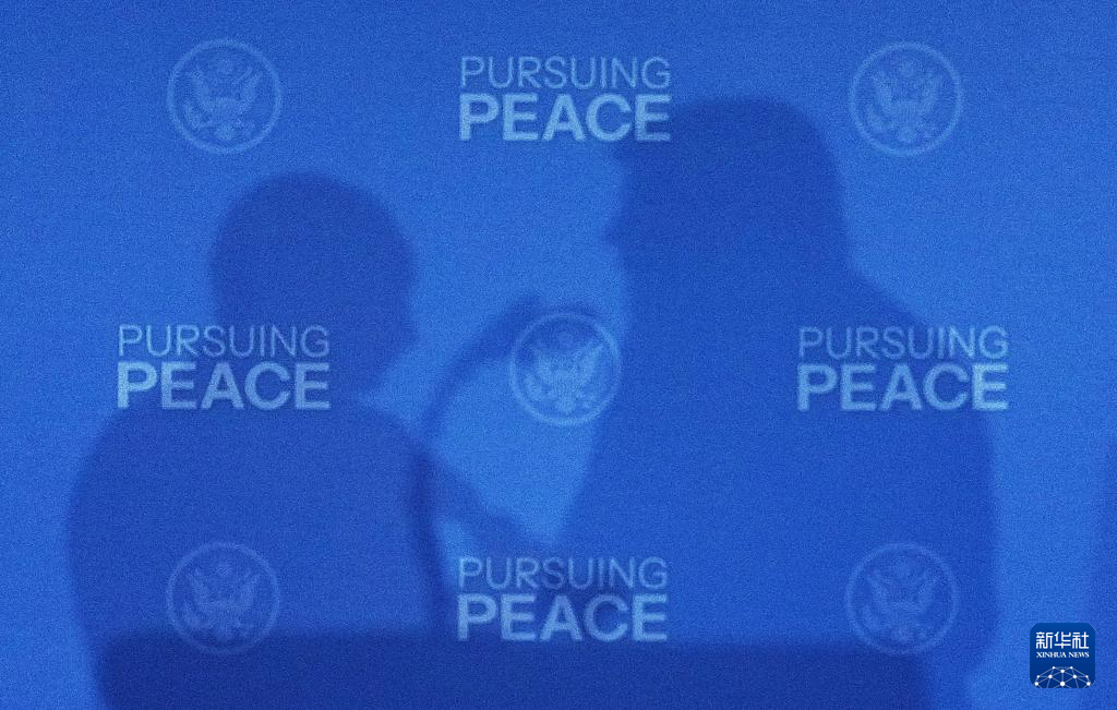 8月15日,美国总统特朗普(右)与俄罗斯总统普京在美国阿拉斯加州安克雷奇市埃尔门多夫-理查森联合军事基地举行会晤后共同出席联合记者会时身影映在现场。