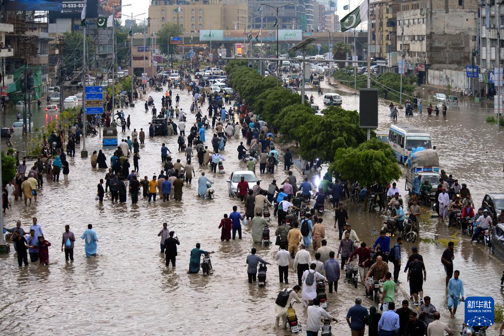 8月19日,在巴基斯坦南部港口城市卡拉奇,当地居民在暴雨过后涉水出行。