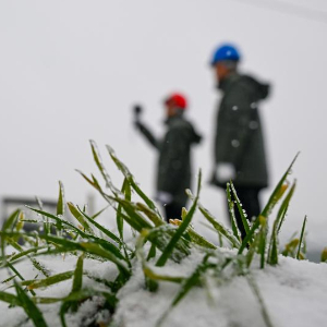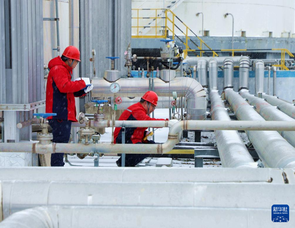 1月19日,在河南省南阳市蓝天燃气有限公司,工人冒雪在燃气供应站进行安全巡检。