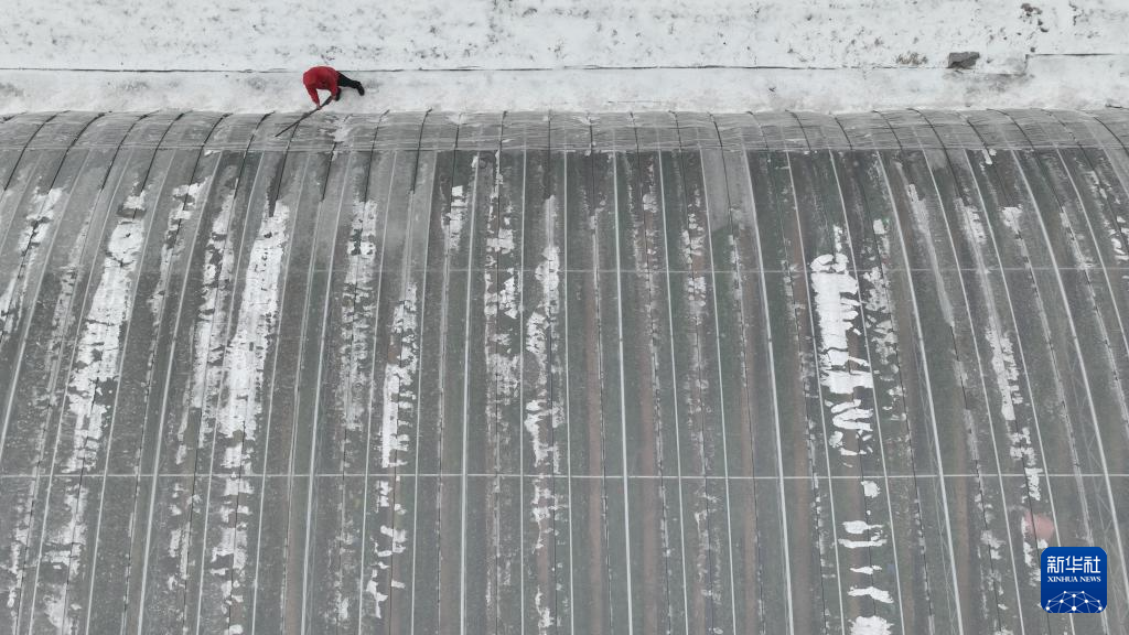 1月19日,在山东省邹平市青阳镇化庄村,菜农在清理大棚上的积雪(无人机照片)。