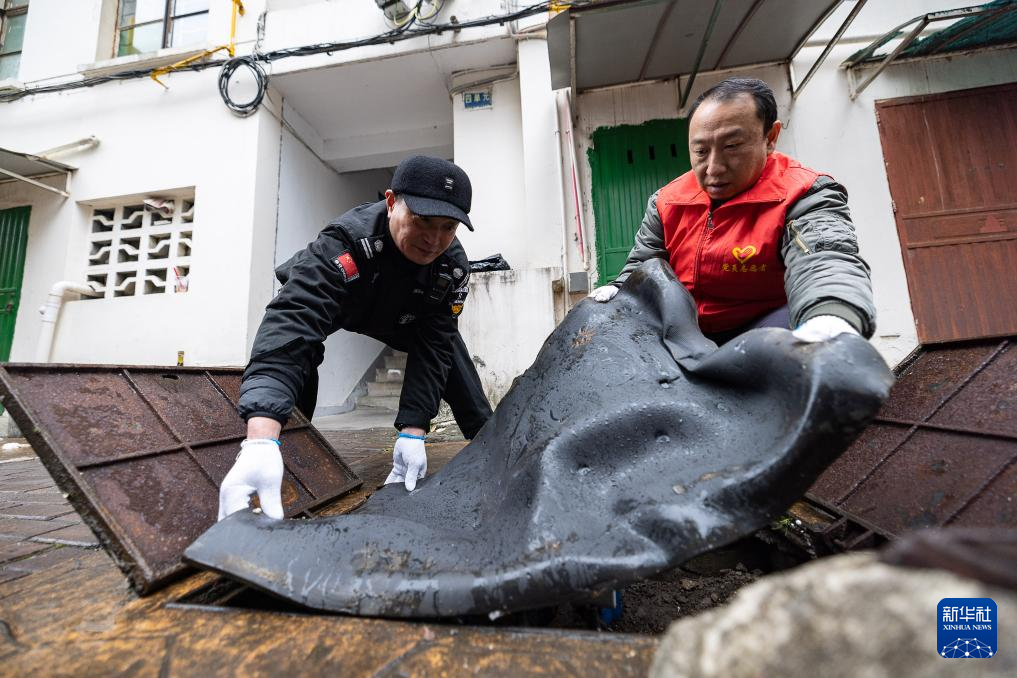 1月19日,志愿者在浙江省湖州市吴兴区龙泉街道西白鱼潭社区一老旧小区包裹供排水管。