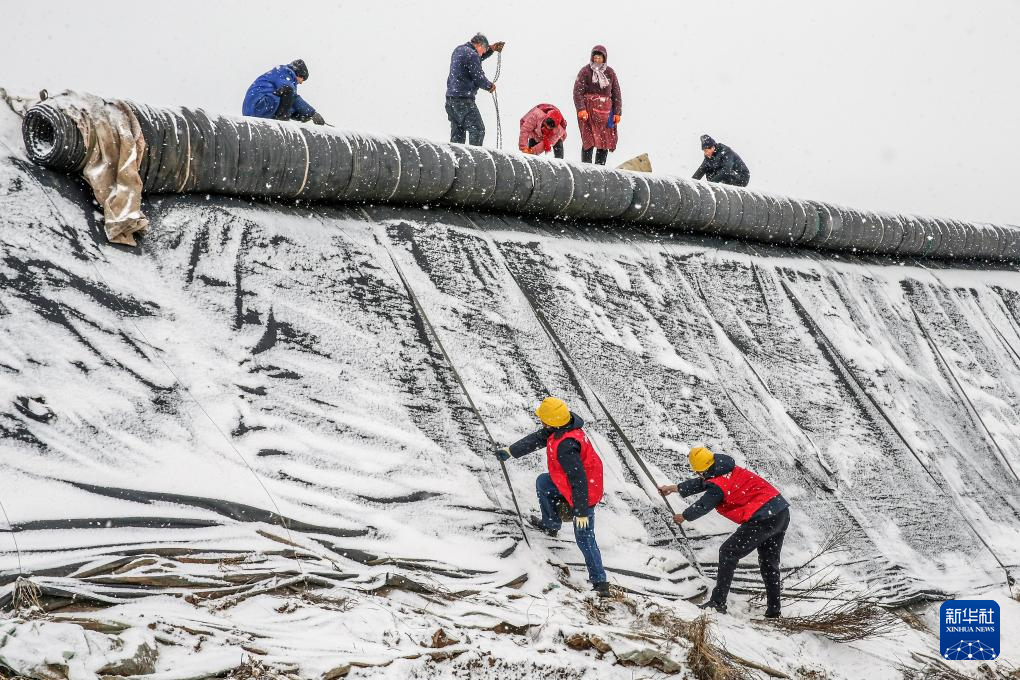 1月19日,在河南省焦作市博爱县孝敬镇博爱源蔬菜专业合作社,辖区供电职工帮助菜农对蔬菜大棚保暖棉被进行维护。
