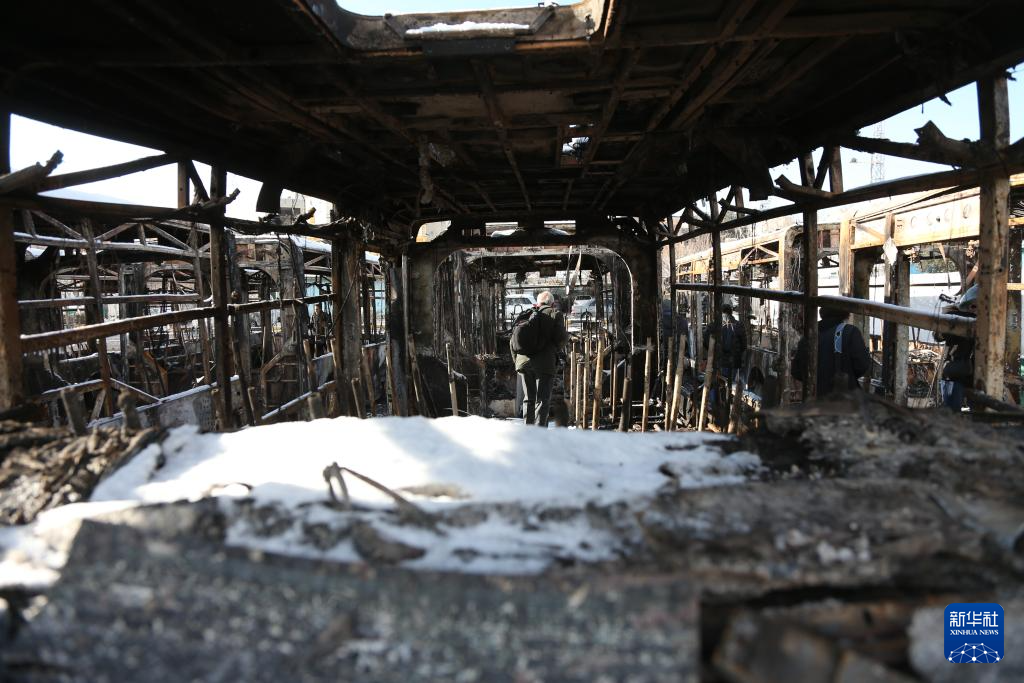 1月21日,在伊朗首都德黑兰,媒体记者在近期骚乱中被烧毁的公交车旁工作。