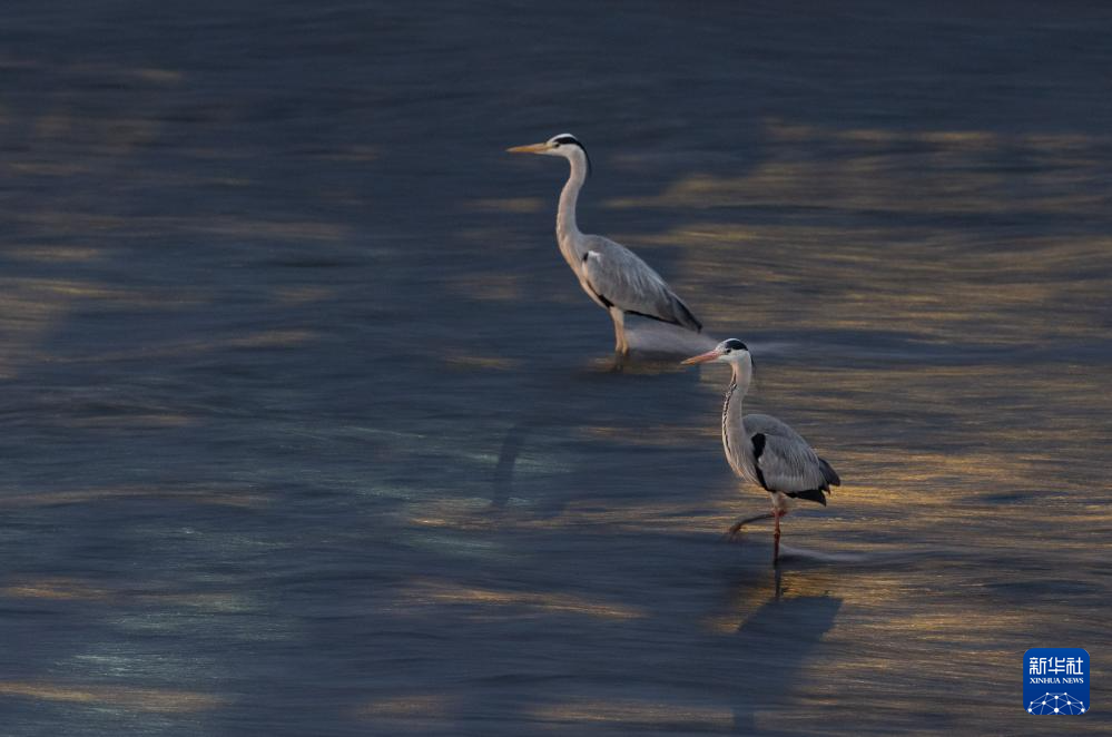 3月17日,两只鹭鸟在锦江河道中迎着逆流“站桩”觅食。