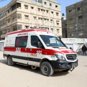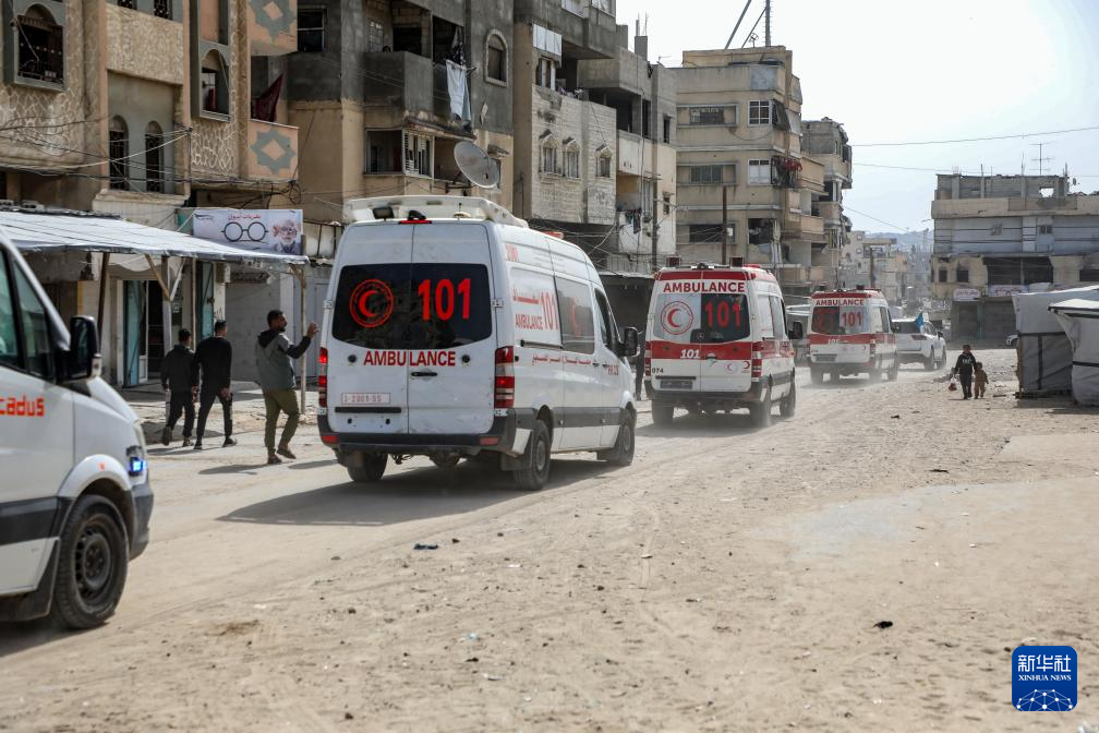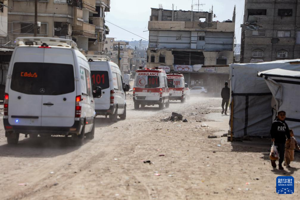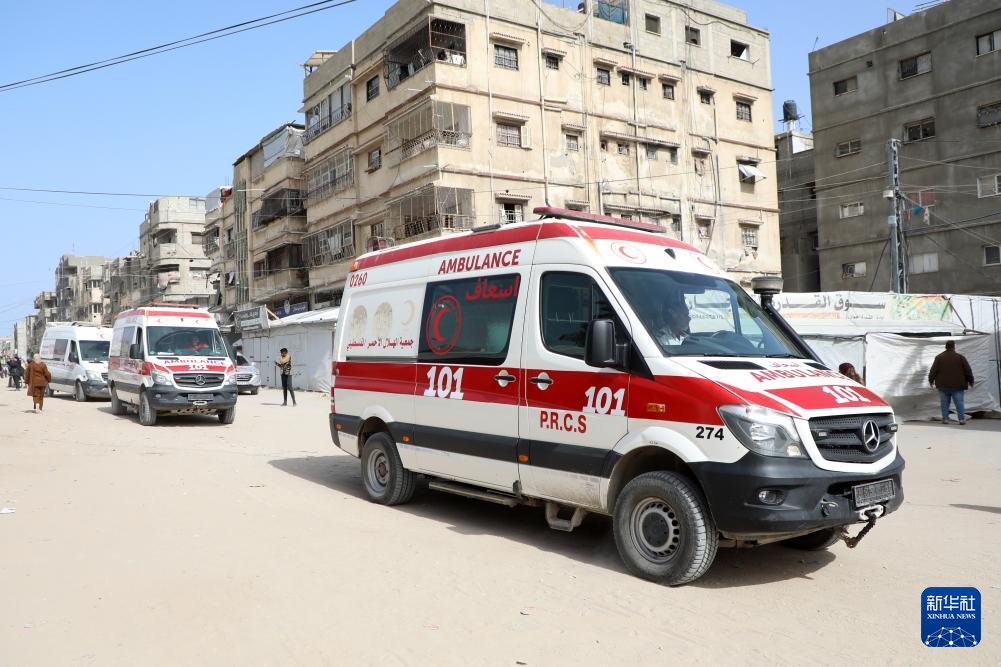 3月19日,在加沙地带南部汗尤尼斯,载有伤患的救护车驶往拉法口岸。
