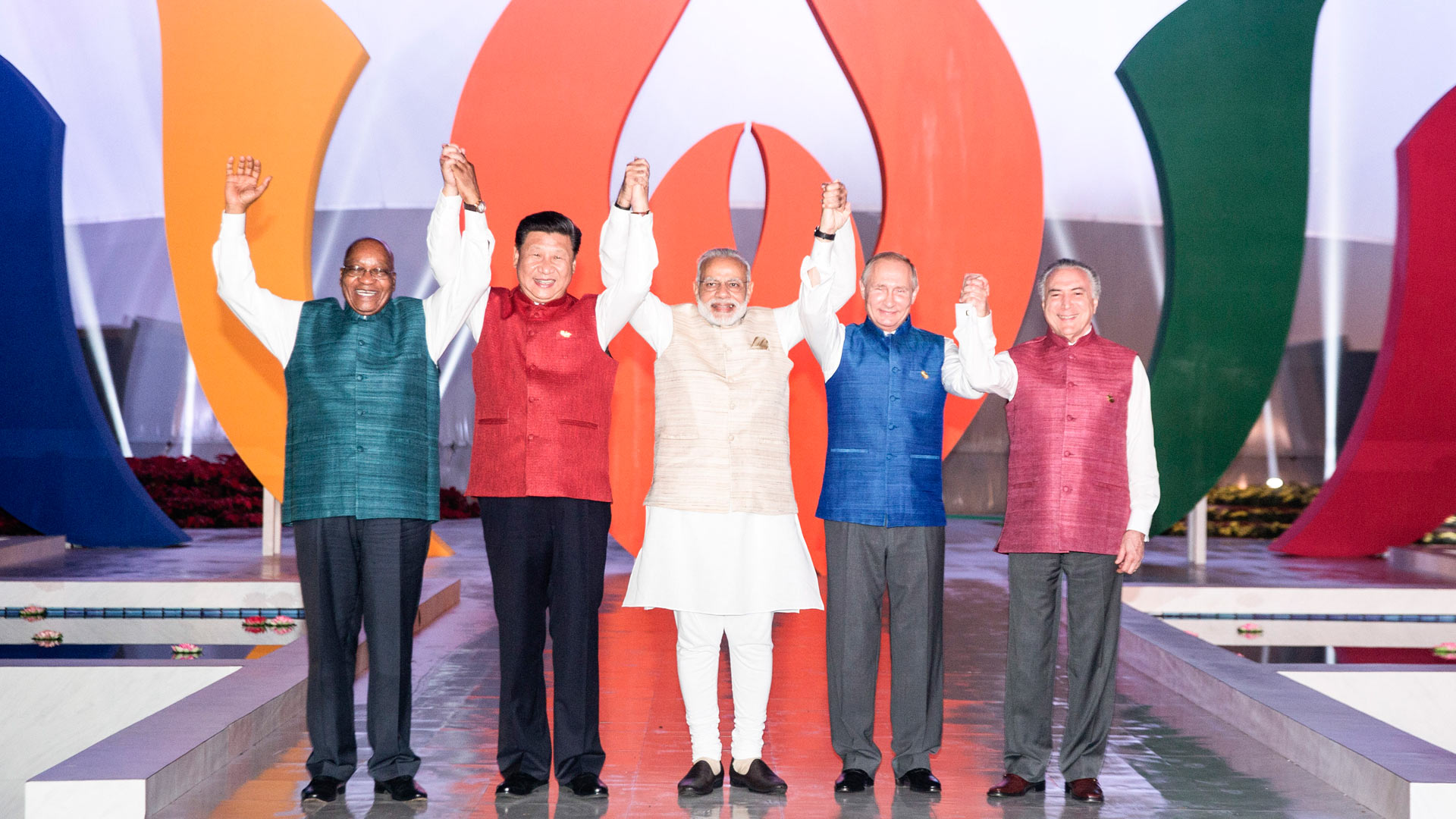10月16日,金磚國家領(lǐng)導(dǎo)人第八次會(huì)晤在印度果阿舉行。中國國家主席習(xí)近平、印度總理莫迪、南非總統(tǒng)祖馬、巴西總統(tǒng)特梅爾、俄羅斯總統(tǒng)普京出席。這是5國領(lǐng)導(dǎo)人合影。新華社記者 謝環(huán)馳 攝