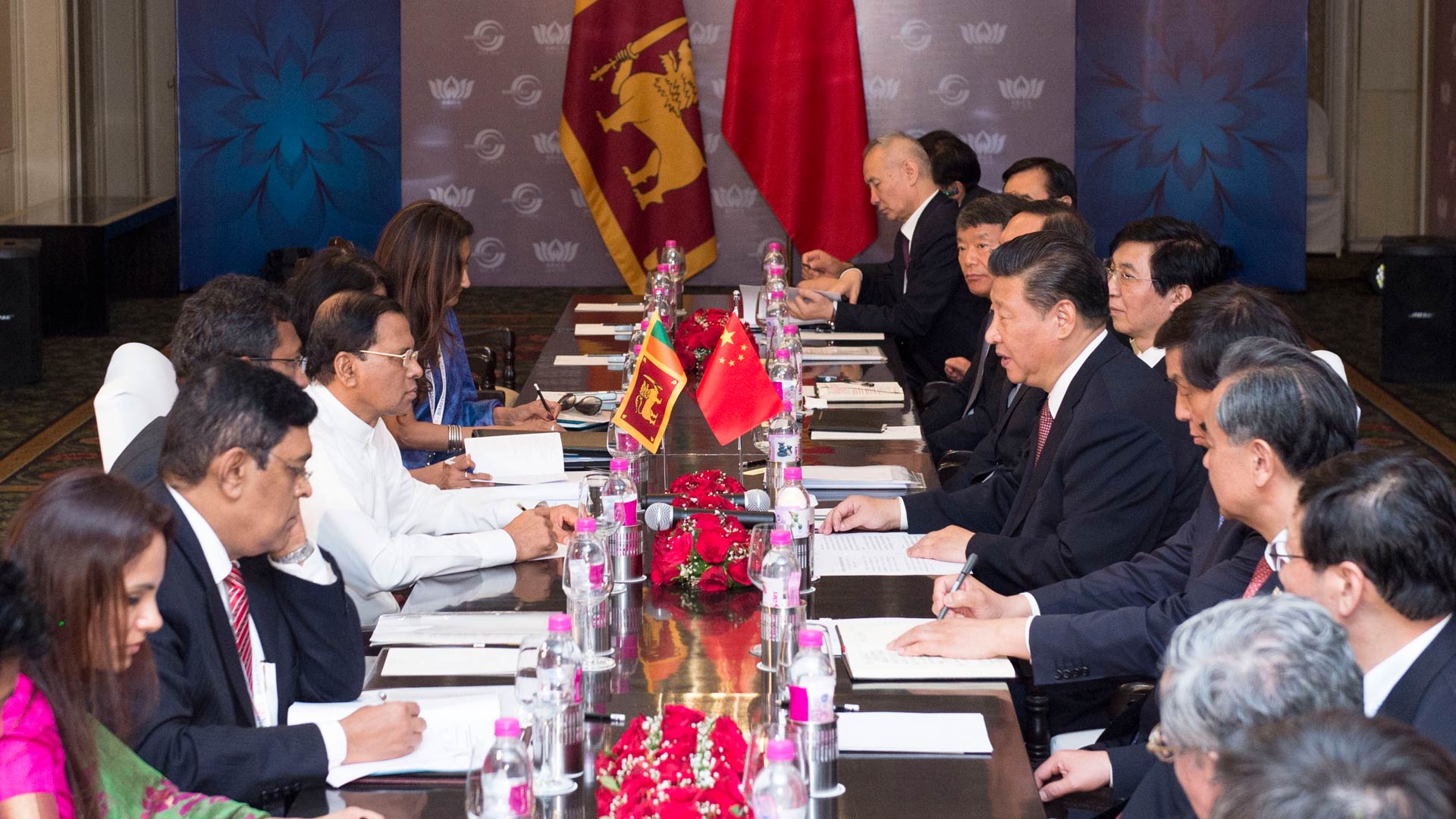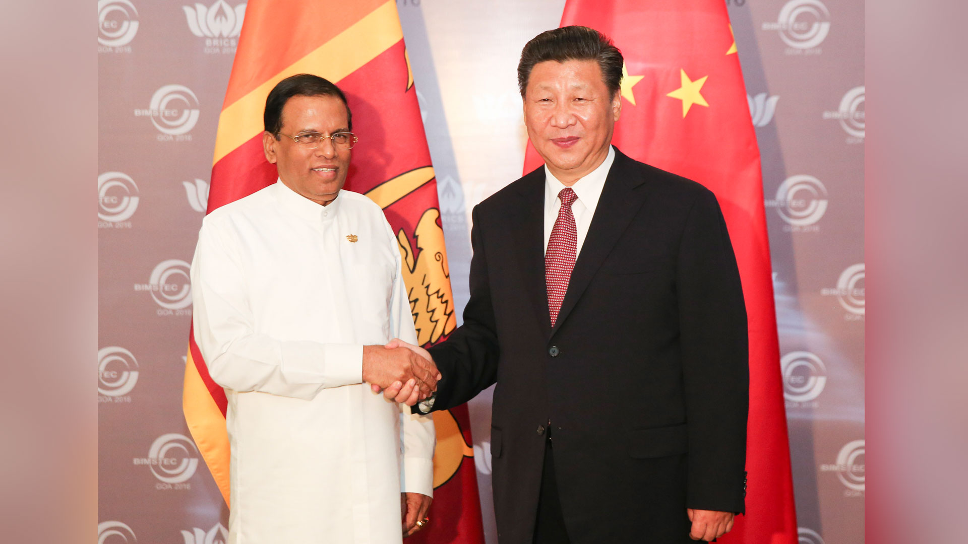 10月16日,國家主席習(xí)近平在印度果阿會(huì)見斯里蘭卡總統(tǒng)西里塞納。 新華社記者 王曄 攝