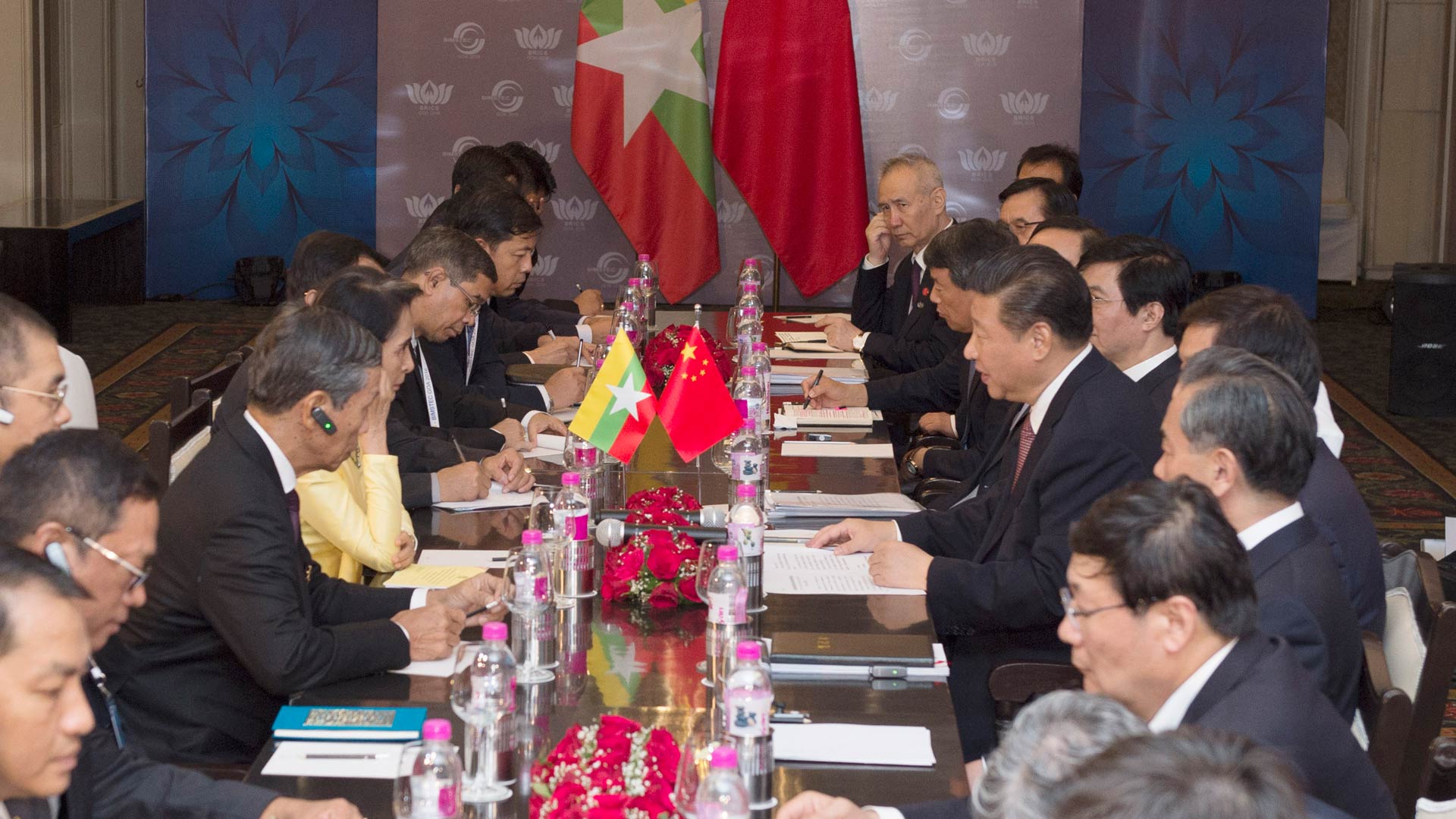 10月16日,國家主席習(xí)近平在印度果阿會(huì)見緬甸國務(wù)資政昂山素季。 新華社記者 王曄 攝