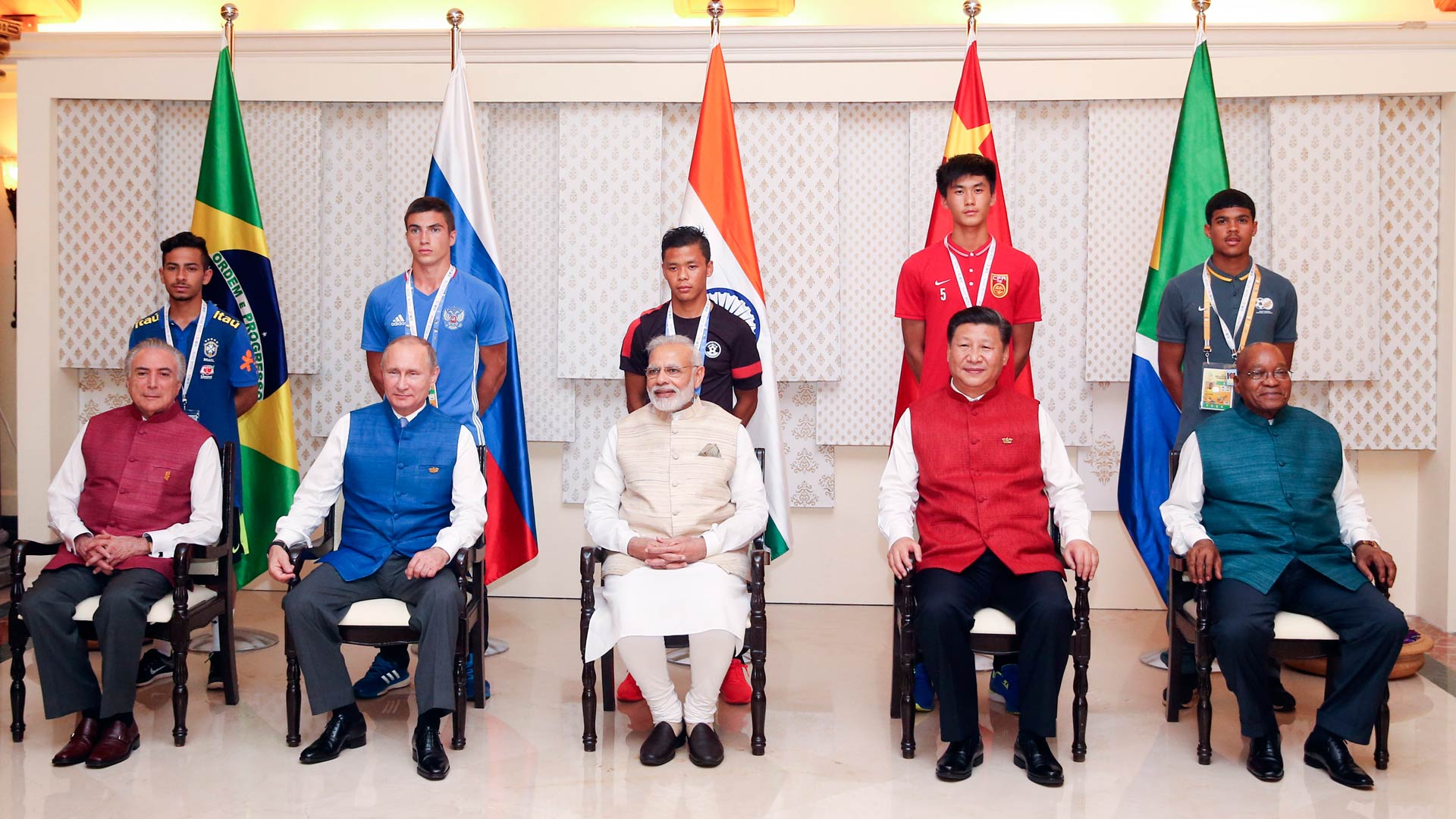 10月15日,國家主席習(xí)近平與印度總理莫迪、南非總統(tǒng)祖馬、巴西總統(tǒng)特梅爾、俄羅斯總統(tǒng)普京在印度果阿同參加金磚國家17歲以下少年足球賽的各國代表隊(duì)隊(duì)長合影。新華社記者 姚大偉 攝