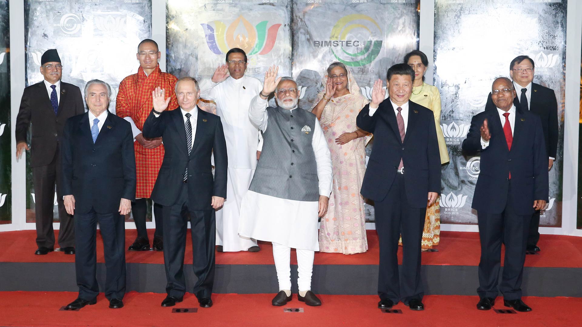 10月16日,金磚國家領(lǐng)導(dǎo)人同“環(huán)孟加拉灣多領(lǐng)域經(jīng)濟(jì)技術(shù)合作倡議”成員國領(lǐng)導(dǎo)人對(duì)話會(huì)在印度果阿舉行。國家主席習(xí)近平同印度總理莫迪、南非總統(tǒng)祖馬、巴西總統(tǒng)特梅爾、俄羅斯總統(tǒng)普京以及斯里蘭卡總統(tǒng)西里塞納、孟加拉國總理哈西娜、不丹首相托杰、尼泊爾總理普拉昌達(dá)、緬甸國務(wù)資政昂山素季、泰國政府代表等共同出席。這是與會(huì)領(lǐng)導(dǎo)人合影。新華社記者 姚大偉 攝