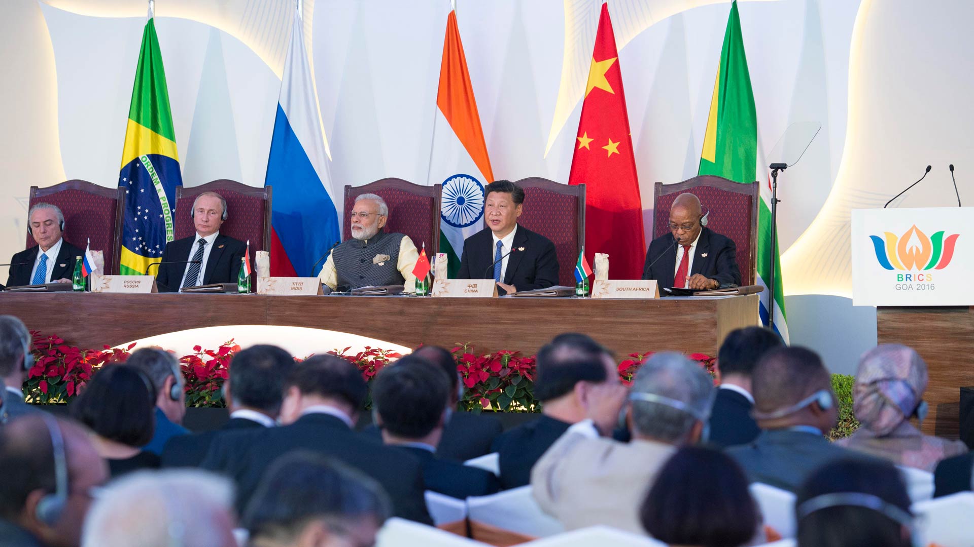 10月16日,金磚國家領(lǐng)導(dǎo)人第八次會(huì)晤在印度果阿舉行。中國國家主席習(xí)近平、印度總理莫迪、南非總統(tǒng)祖馬、巴西總統(tǒng)特梅爾、俄羅斯總統(tǒng)普京出席。習(xí)近平發(fā)表題為《堅(jiān)定信心 共謀發(fā)展》的重要講話。新華社記者 姚大偉 攝