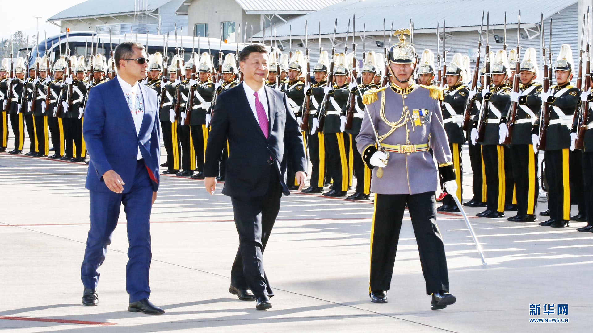 當地時間11月17日,國家主席習近平乘專機抵達基多,開始對厄瓜多爾共和國進行國事訪問。這是厄瓜多爾總統(tǒng)科雷亞在機場為習近平舉行隆重歡迎儀式。新華社記者 鞠鵬 攝2016-11-18
