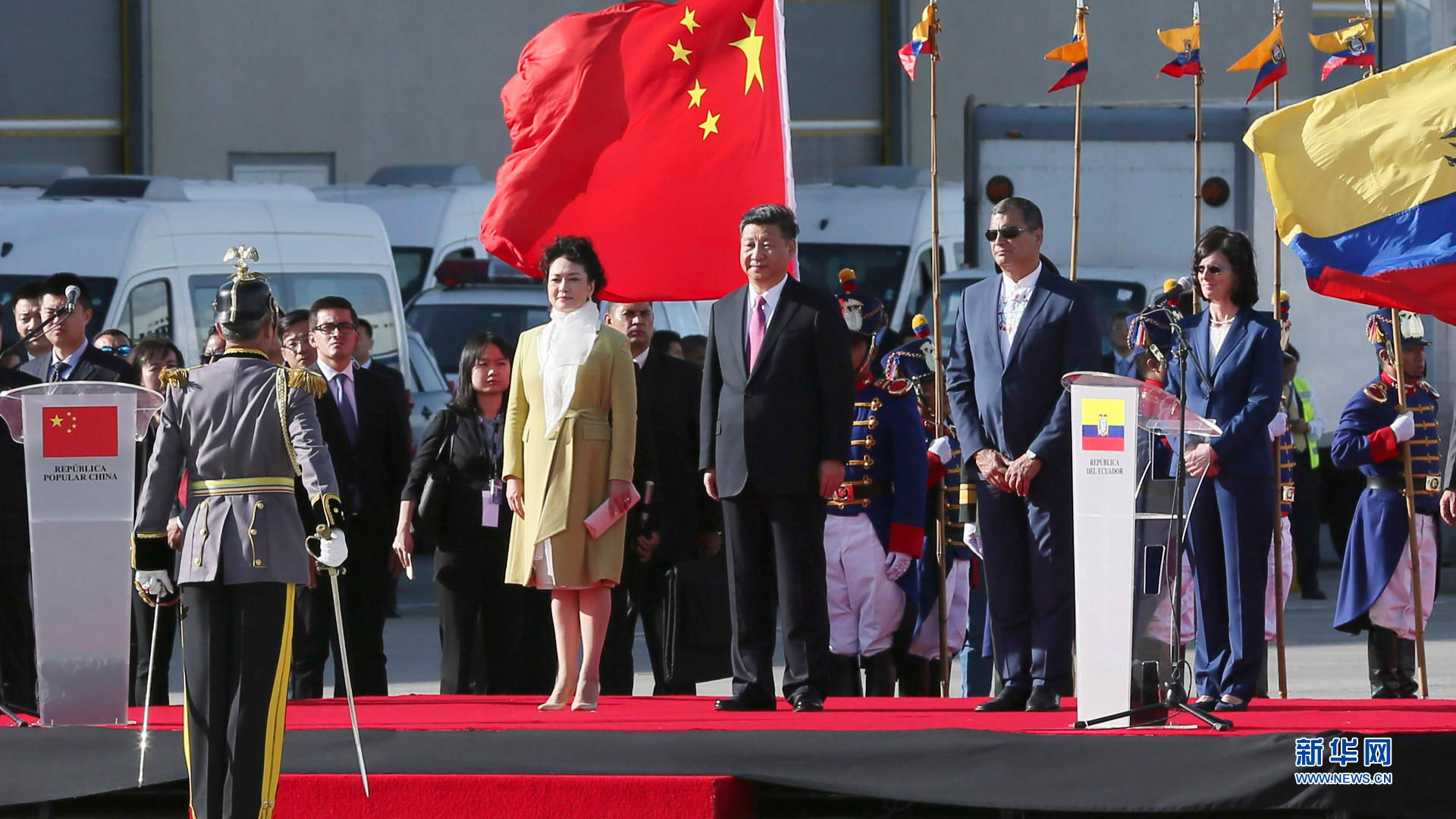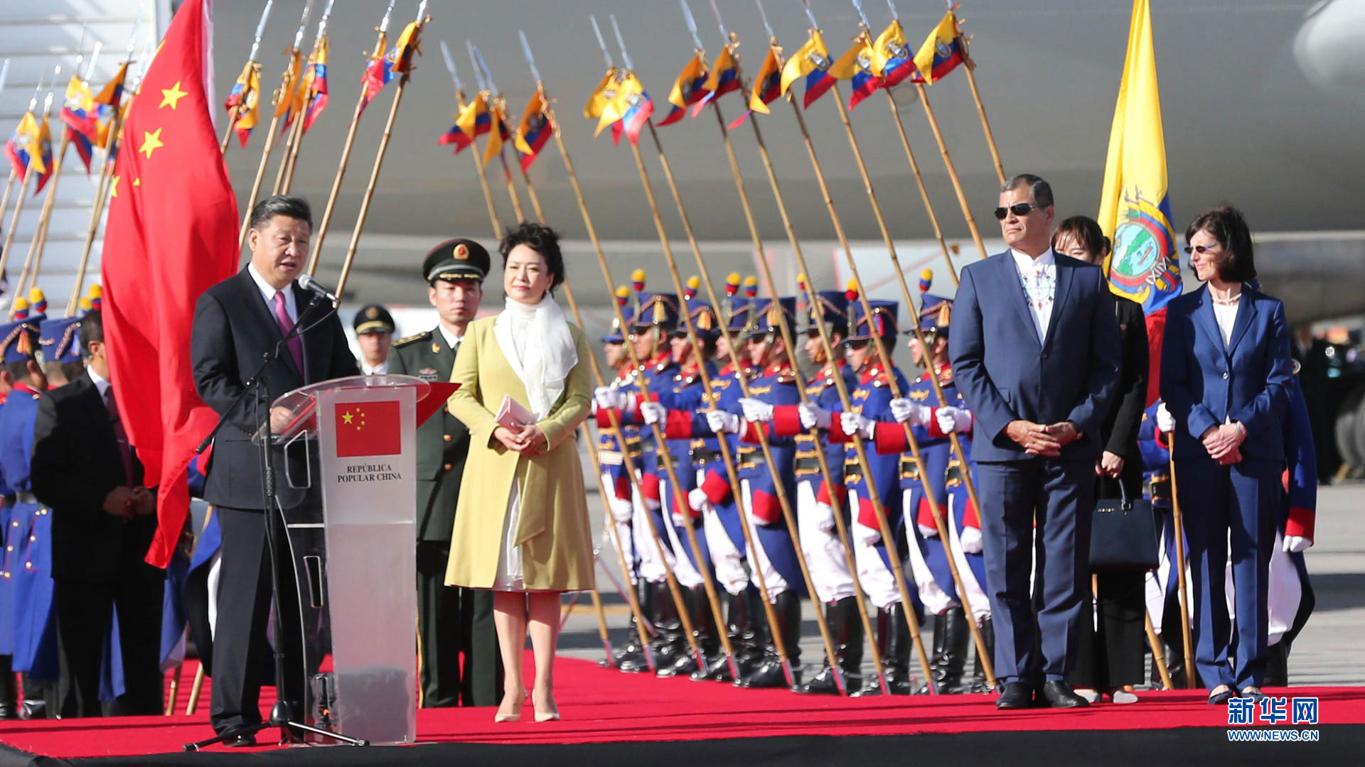 當地時間11月17日,國家主席習近平乘專機抵達基多,開始對厄瓜多爾共和國進行國事訪問。厄瓜多爾總統(tǒng)科雷亞和夫人馬勒布等在機場熱情迎接習近平和夫人彭麗媛。新華社記者 鞠鵬 攝2016-11-18