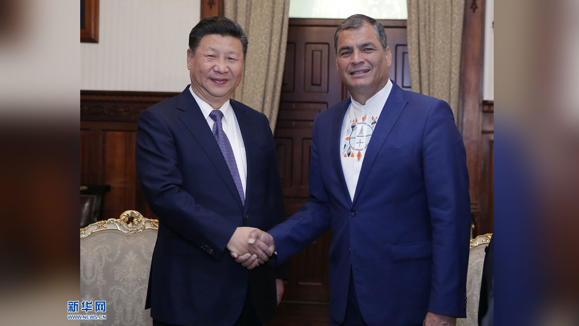 當地時間11月18日,國家主席習近平在基多會見厄瓜多爾國民代表大會主席里瓦德內拉。 新華社記者 鞠鵬 攝2016-11-19