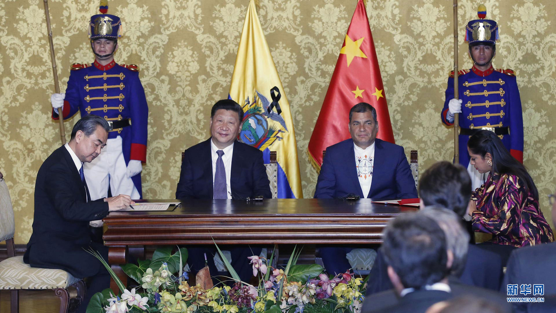 當地時間11月17日,國家主席習近平在基多同厄瓜多爾總統(tǒng)科雷亞舉行會談。這是會談后,兩國元首見證雙邊合作文件的簽署。 新華社記者 鞠鵬攝2016-11-18