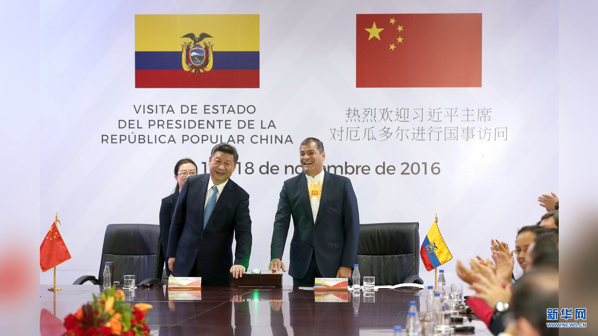當地時間11月18日,國家主席習近平在基多同厄瓜多爾總統(tǒng)科雷亞共同出席中方援建的厄瓜多爾公共安全應急指揮中心聯合實驗室揭牌儀式,喬內醫(yī)院奠基、科卡科多-辛克雷水電站竣工發(fā)電視頻連線活動。這是兩國元首共同按動按鈕,辛克雷水電站正式竣工發(fā)電。新華社記者 馬占成 攝2016-11-19